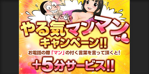 お電話の際に「マン」の付く言葉を言って頂くと、もれなく+5分サービス!!